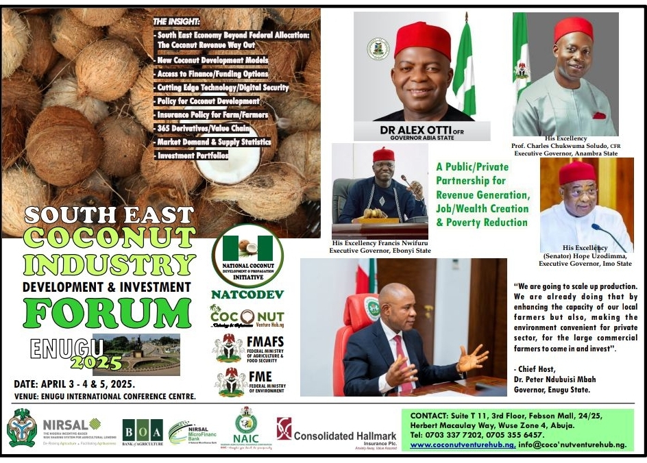 South East Coconut Industry Development & Investment Forum. 2024-07-25 South East Coconut Industry Development & Investment Forum.Enugu 2025Date: April 3- 4 2025Venue: Enugu International Conference Center Plan to Attend. Reserve your Spot